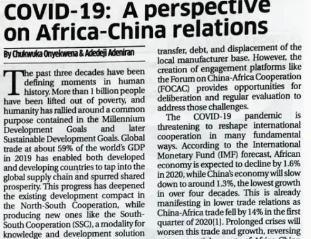 日前,尼日利亞非洲經(jīng)濟(jì)研究*主任奧耶坤納在尼主流媒體《每日信報(bào)》發(fā)表題為《新冠肺炎疫情:透視非中關(guān)系》的評(píng)論文章,認(rèn)為非中關(guān)系平等互利,講求協(xié)調(diào)性而非競(jìng)爭(zhēng)性,是南南合作的典范。面對(duì)新冠肺炎疫情,非中雙方需加強(qiáng)團(tuán)結(jié)合作抗疫,努力恢復(fù)經(jīng)濟(jì),繼續(xù)維持雙贏態(tài)勢(shì)。